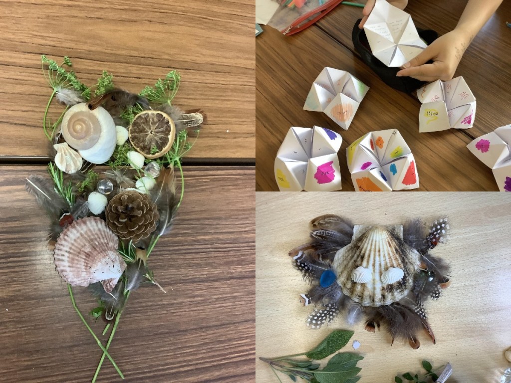 Creativity Workshop – this workshop involved creative games and some wonderful making. We used natural materials such as shells, fresh herbs, feathers and gems to make some fun and fantastic art pieces. We also made a fortune teller to help give us ideas for things we could do to help our wellbeing and boost our mood.