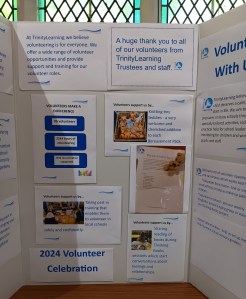 TrinityLearning has around 70 volunteers, and presentation boards at the event highlighted just some of the many ways they support our work both in schools – as Thinking Books volunteers or part of our Kingfisher school singing group, as well as from home – knitting toys, and making up resource packs.