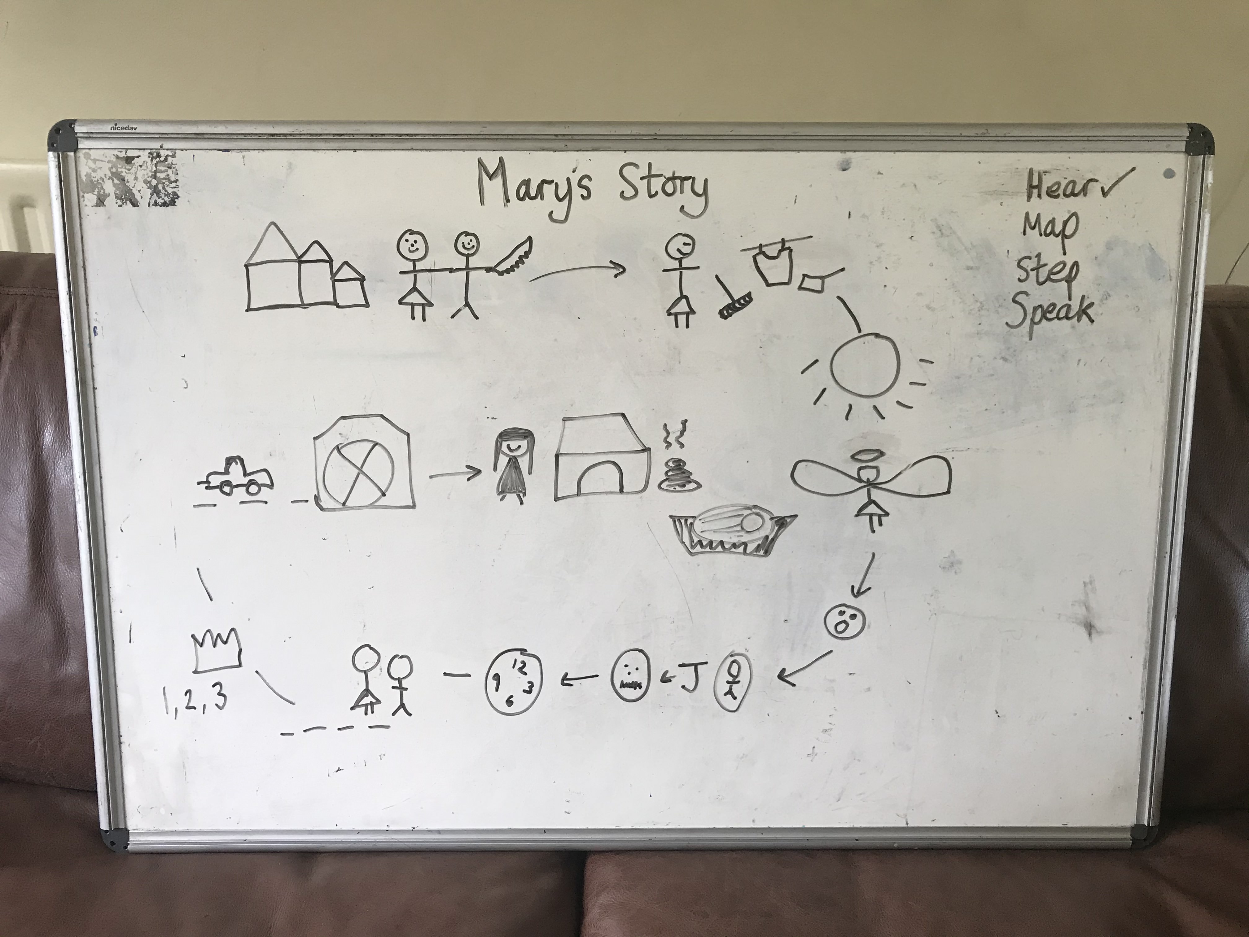 In the first video on this page you can hear our storyteller, Taz, telling Mary’s story. The other videos show how Taz learnt to tell the story using a method devised by Storytelling Schools. This method is a simple, effective way of helping children learn to tell stories. First you hear the story, then map the story, step the story and then step the story several times both with and without your map. Finally, you are ready to tell the story yourself.